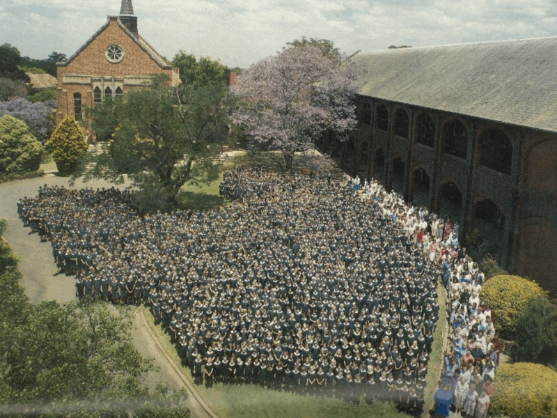 On a few important occasions, whole school photographs have been taken and at one stage, a cherry picker was employed to capture an all-school photo. A past Principal, Miss Buckham, went up in the cherry picker in the 80s as part of one such photo, much to the delight of the students! Perhaps you remember this?
