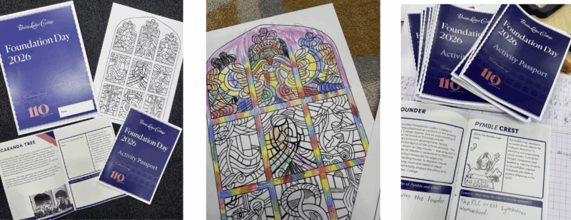 Archive activities created for Foundation Day 2026. The centre image is a kindergarten student’s colouring in of the stained-glass windows.