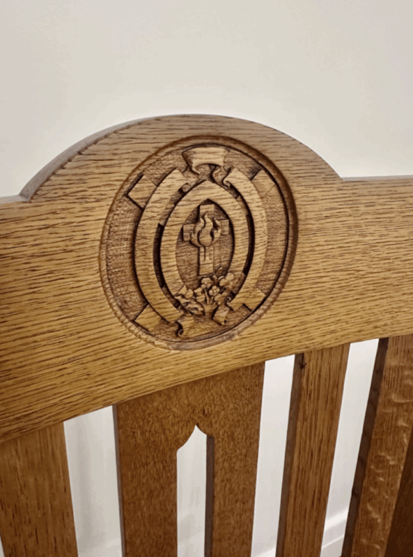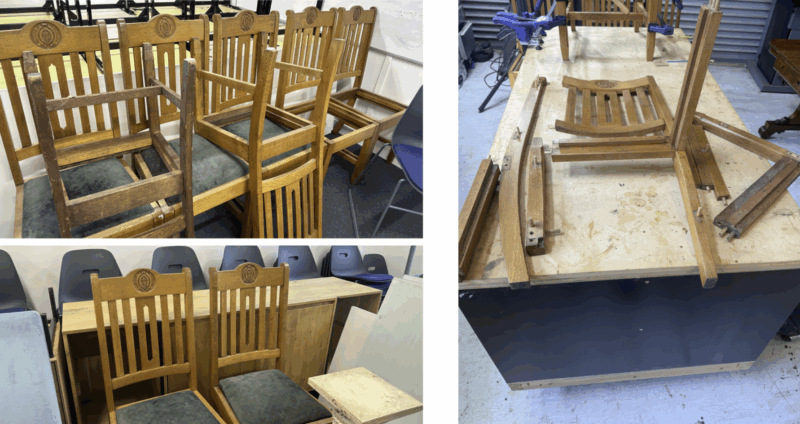After. Our beautiful carved chairs have been restored, reinforced and refinished to return them to their former glory. They are now being utilised again in the College and their story continues